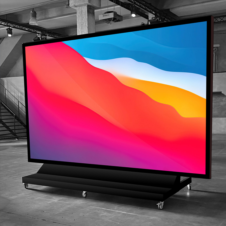 Na zlecenie klienta wykonaliśmy dwa efektowne ekrany konferencyjne o przekątnej 186 cali. Całkowity wymiar ekranu wynosi 416x266cm gdzie powierzchnia wyświetlacza to 400x250cm. Ekran został oprawiony w elegancją matową ramę wykonaną z lekkiego kompozytu, dzięki temu wyświetlacz idealnie wpasował się w loftowy charakter galerii wystawienniczej. Podstawa ekranu wykonana ze stalowych profili, wyposażona w 6 kółek z hamulcem. Konstrukcję podstawy również zabudowaliśmy frezowaną płytą kompozytową z wyciętym emblematem galerii.